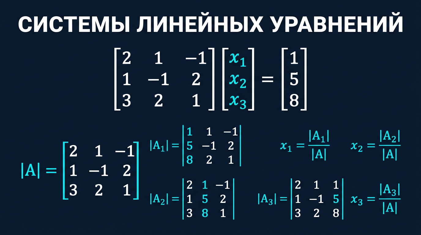 Для системы 2x + y = 5; x − y = 1: D = −3, D₁ = −6, D₂ = −3, x₁ = 2, x₂ = 1.