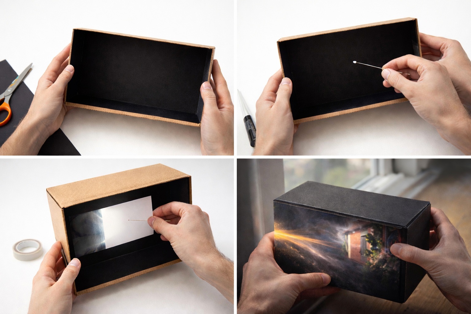 После этого нужно закрыть коробку и направить отверстие на яркий объект — например, окно или освещённый дом напротив. Внутри появится слабое перевёрнутое изображение.