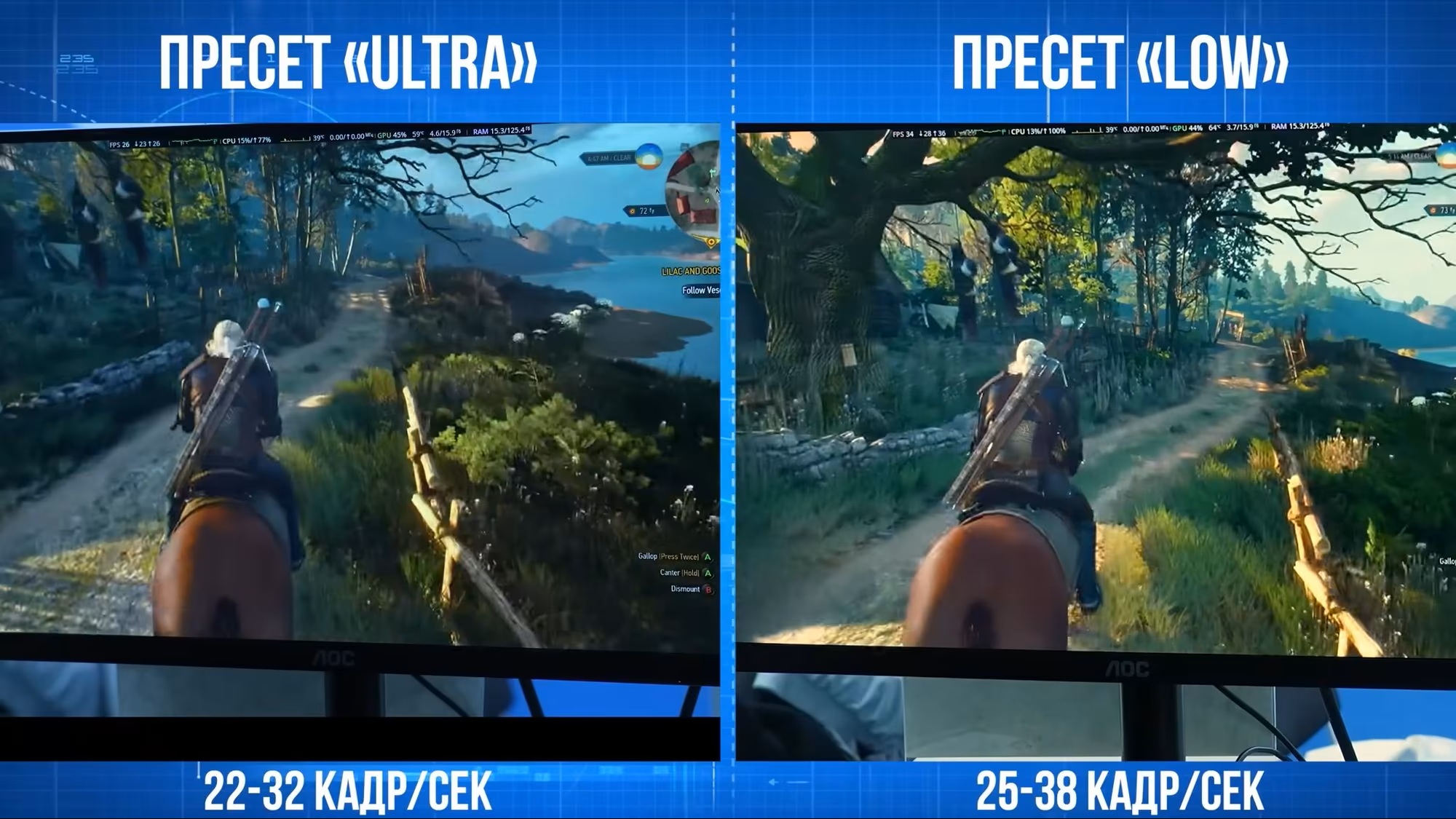 По итогам теста The Witcher 3 на высоком пресете Ultra показывал около 22–32 кадров в секунду. На низких настройках Low результат составлял примерно 25–38 FPS. Небольшая разница между режимами косвенно подтверждает, что система была ограничена именно процессором, а не графическим ускорителем.