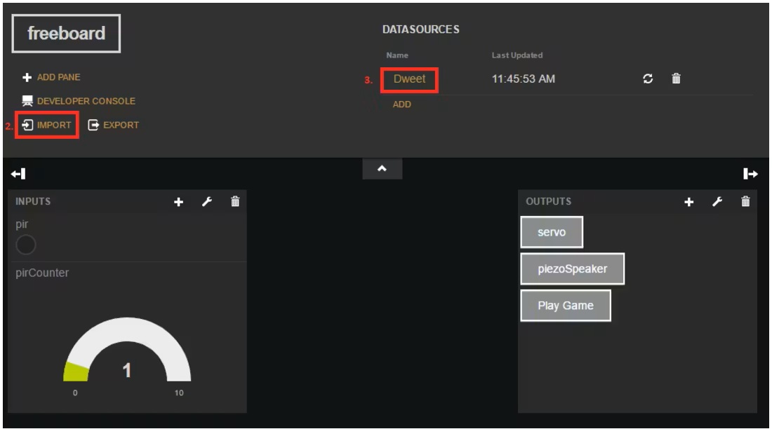 Это перенаправит вас на freeboard.io, где вы получите базовую панель управления, уже подключенную к вашему скетчу Arduino с использованием уникального имени устройства (thingName). Вы можете увидеть имя своего устройства в предоставленном файле firmware.ino.