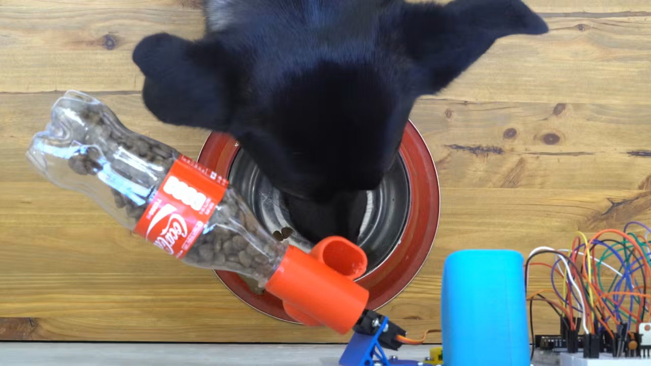 Идея проста: вы настраиваете сценарий — например, кормушка подает звуковой сигнал, а когда собака подходит, PIR-датчик фиксирует движение и сервопривод открывает заслонку. Но возможности шире: можно добавить датчик веса, чтобы контролировать количество корма в миске, или цветные светодиоды, сигнализирующие о разных состояниях. А с помощью ESP8266 и бесплатного сервиса Freeboard вы получаете веб-панель для ручного управления с любого устройства.