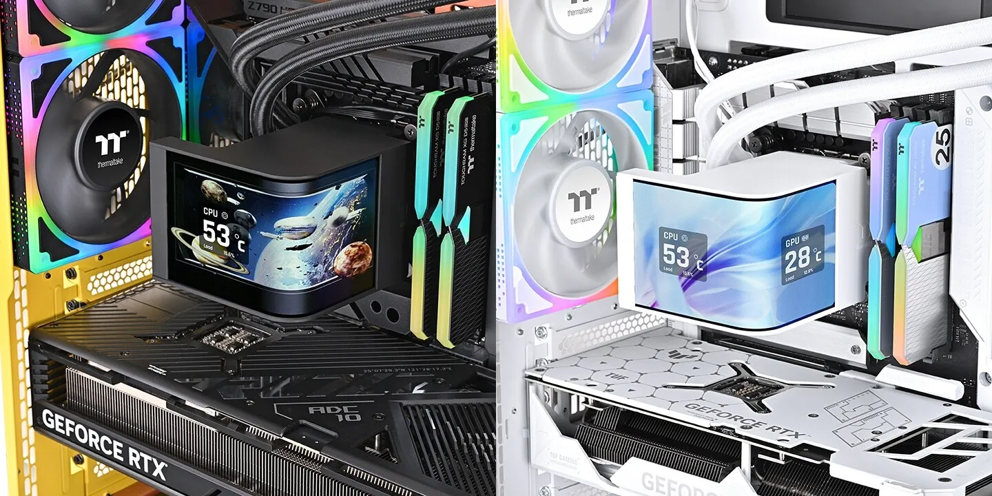 Thermaltake анонсировала флагманскую необслуживаемую систему жидкостного охлаждения MAGCurve 360 Ultra ARGB Sync, главной особенностью которой стал огромный изогнутый AMOLED-экран, встроенный в водоблок.