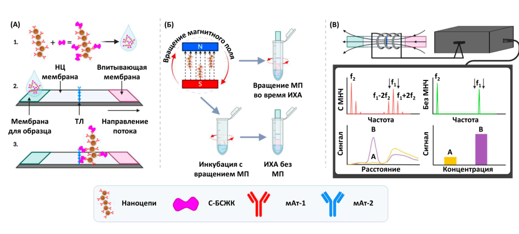 Тест использует наноцепочки из оксида железа, покрытые антителами к маркеру сБСЖК. Вращающееся магнитное поле ускоряет связывание маркера с антителами и концентрирует их на тестовой линии. Результат считывается портативным магнитным прибором.