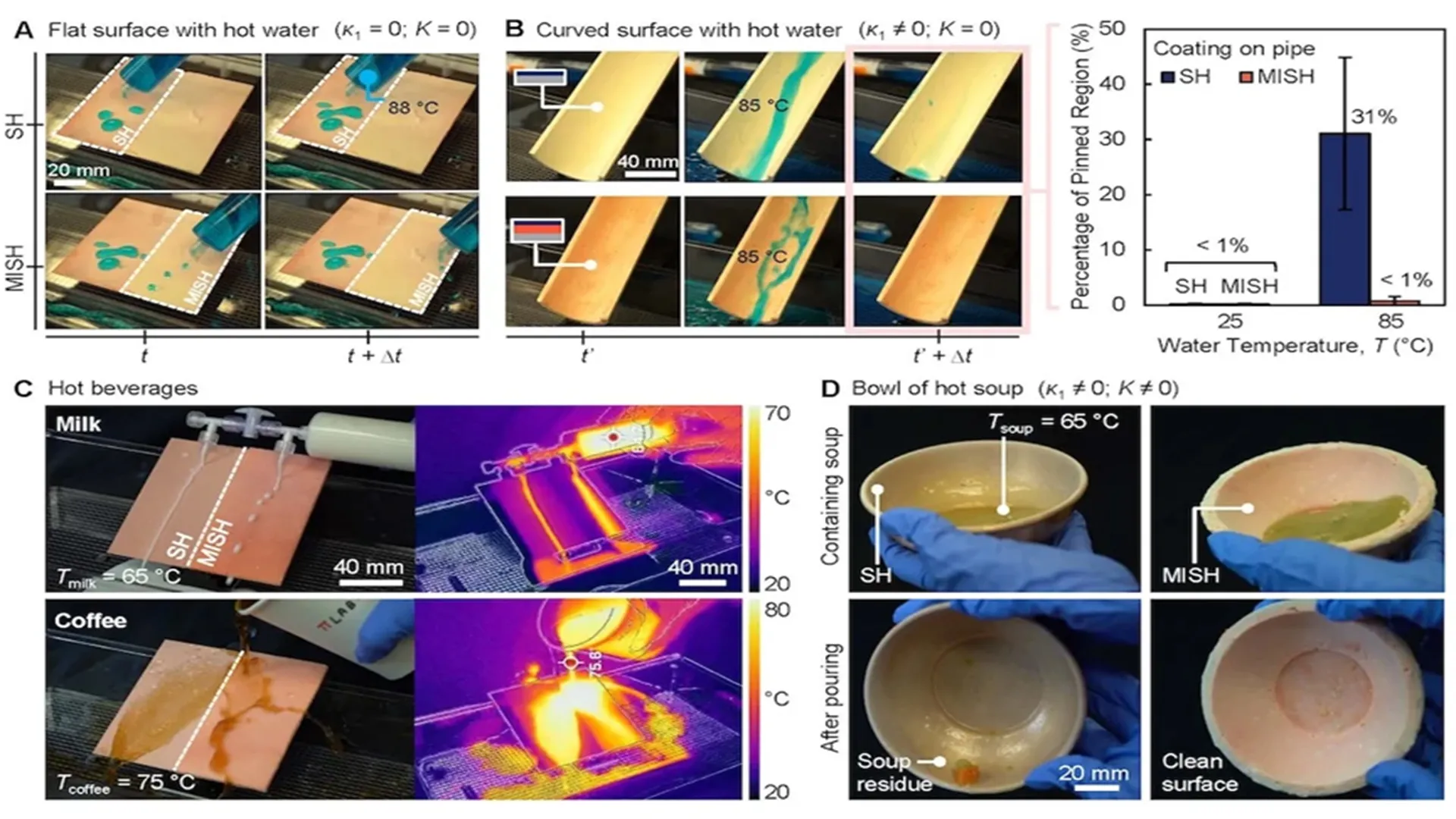 Чтобы доказать, что технология работает не только в лаборатории, ученые покрыли большие металлические пластины, изогнутые трубы и обычные кухонные чашки. На них лили горячее молоко, кофе и даже гороховый суп. На MISH оставалось менее одного процента осадка. На стандартных покрытиях — больше 30 процентов.