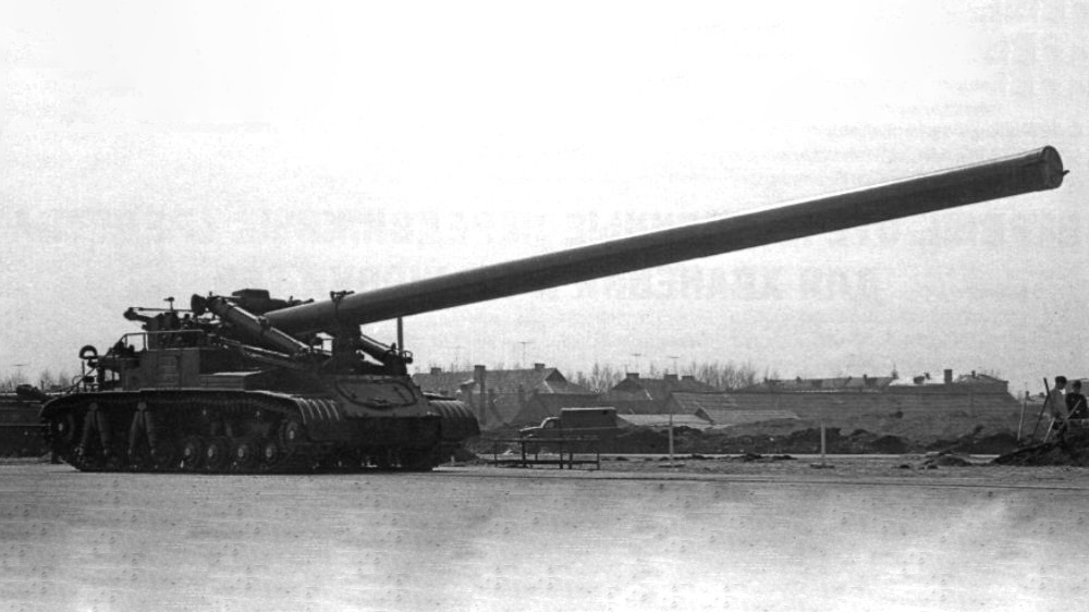 Машина получилась впечатляющей. Длина ствола — почти 20 метров. Полная боевая масса — около 50 тонн. Базировалось все это на шасси тяжелого танка Т-10 с семью катками на борт. Для перезарядки требовался специальный кран — вручную 750-килограммовую болванку не поднять.